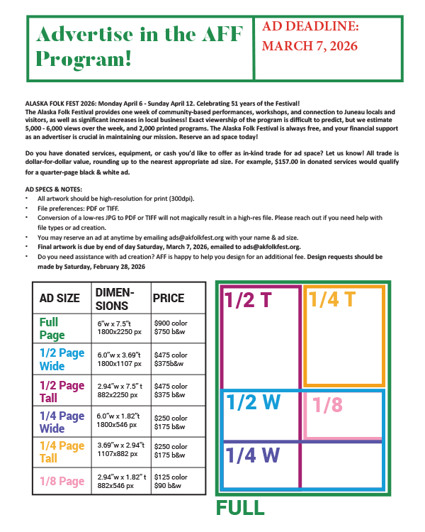 The Alaska Folk Festival provides one week of community-based performances, workshops, and exposure to Juneau locals and visitors, as well as a significant boost in local business! Exact viewership of the Alaska Folk Festival program is difficult to predict, but we estimate 5,000 - 6,000 views over the week from 2,000 printed programs. The Alaska Folk Festival is always free, and your financial support as an advertiser is crucial in maintaining our mission. Reserve an ad space today!